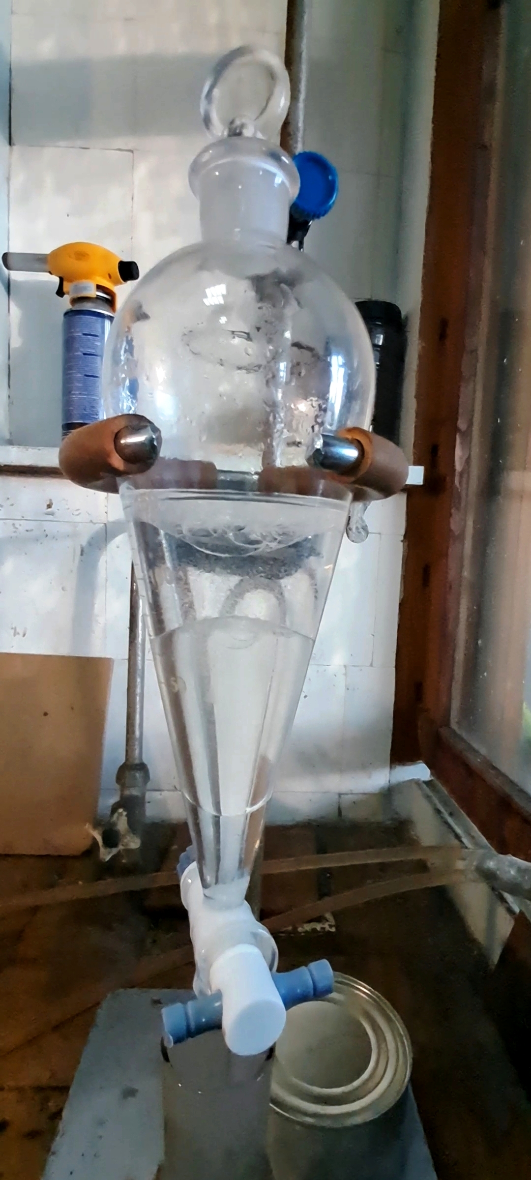 Наблюдал еще более интересное явление. ДВЕ несмешивающиеся жидкости образовали ТРИ слоя. Жидкость 1 - жидкость 2 - жидкость 1. Как такое возможно? Плотности водного раствора и органической фазы практически совпадали. Мало того, что образовывались сантиметровые шарики одной жидкости, которые подолгу плавали в слое другой, так еще и сформировалось три слоя.