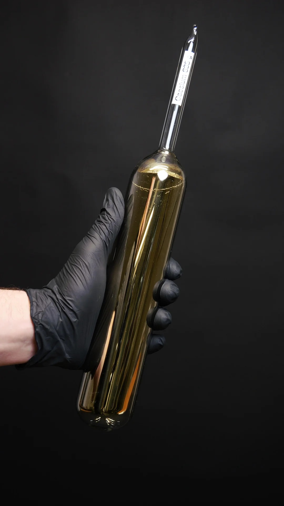 I recently transferred about 2.3 kg of caesium from a round bottom flask into several smaller ampoules. We made it by reducing caesium chloride with lithium. At some point in the future I want to distill all the cesium into one large clean ampoule. But there’s still a lot of preparation needed for that project. Until then I thought some of you might enjoy these photos.