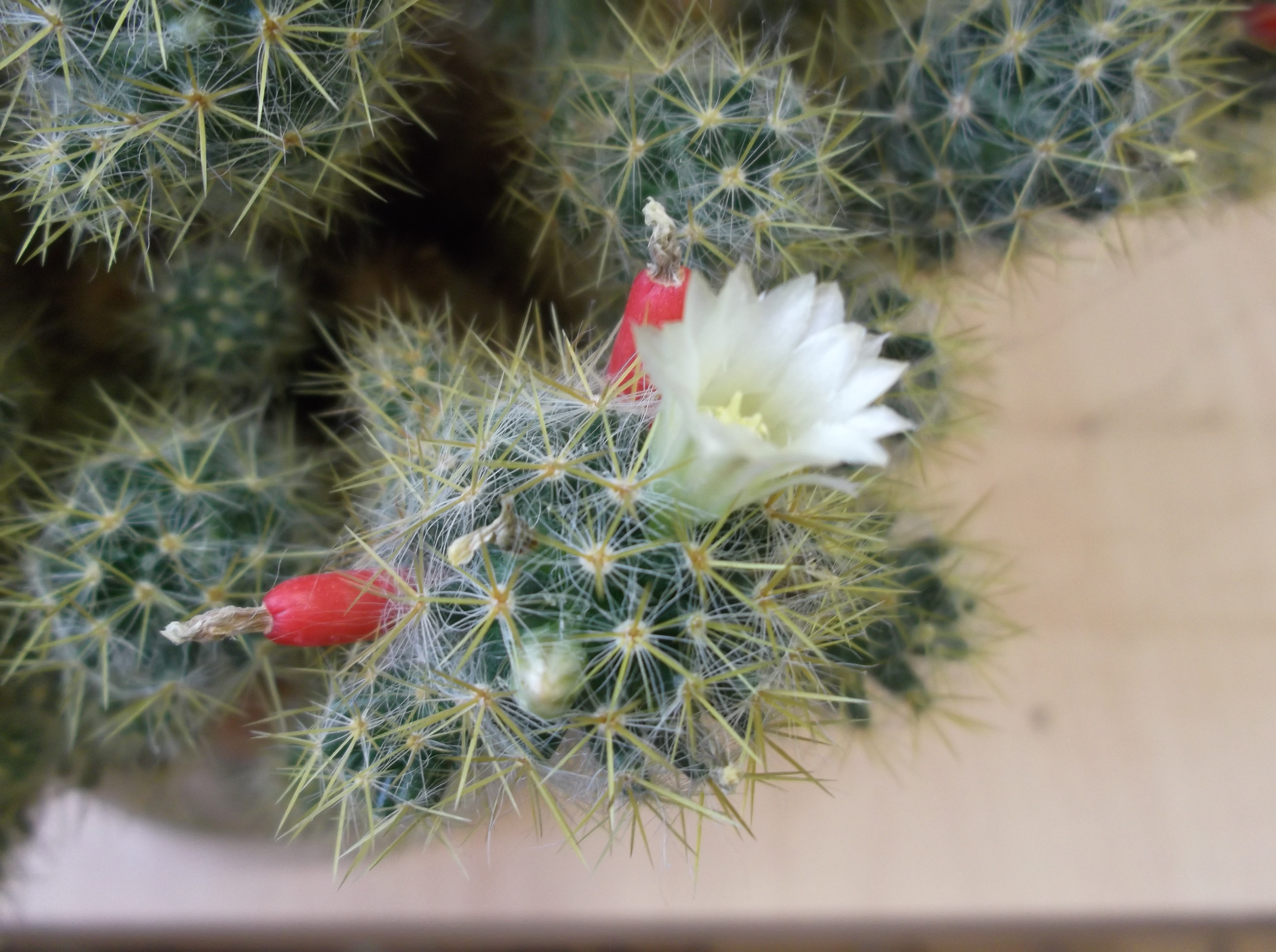 Mammilaria prolifera. Растет у нас такой. 13 лет уже исполнилось. Цветет регулярно каждый год. Плоды кстати приятного кисло-сладкого вкуса. Антидот нитратов (в т.ч. органических).
