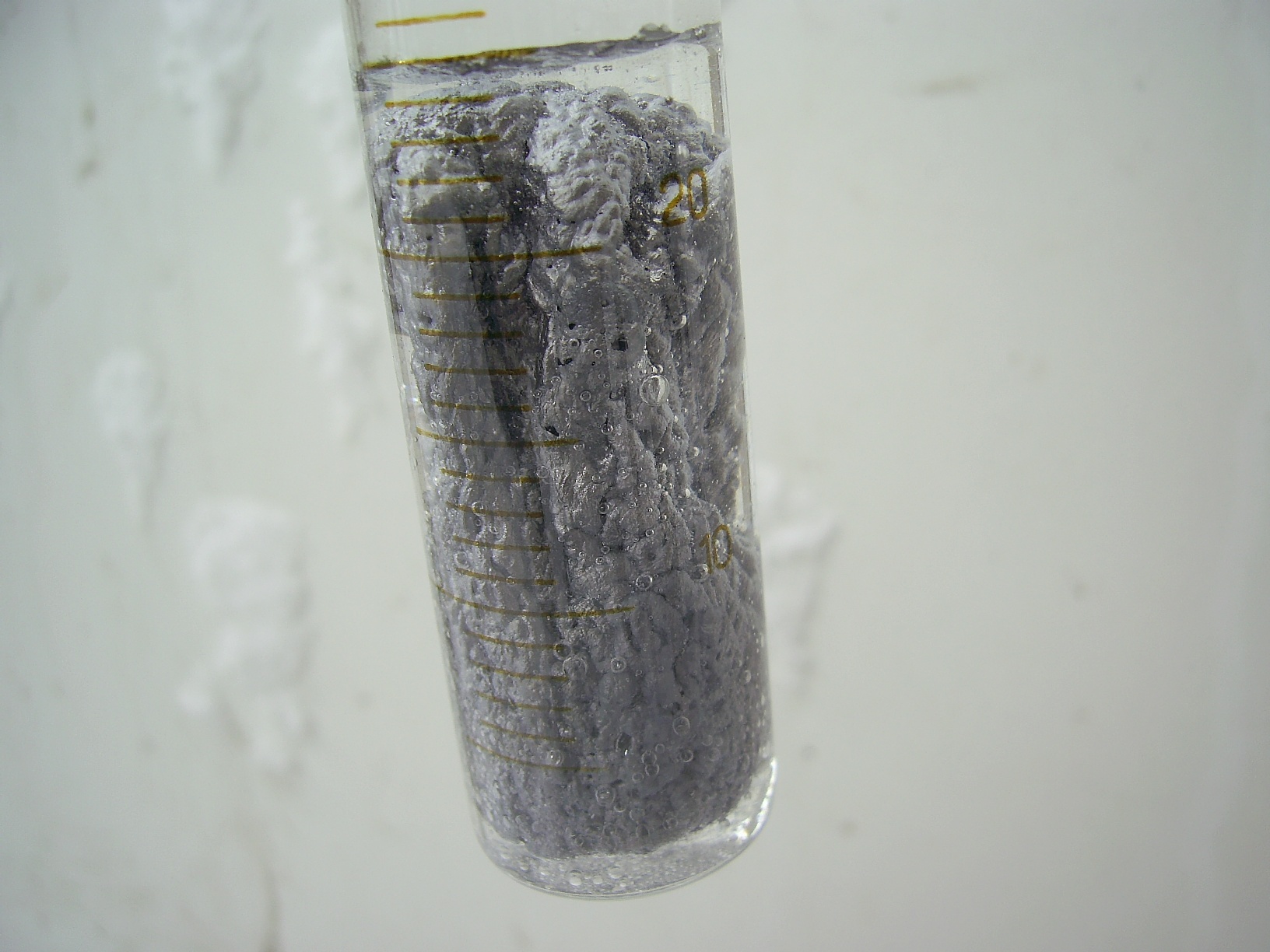 Очень быстро образовалась губчатая масса большого объёма. Рост её сопровождался лёгким шипением. Масса увеличивалась и возникло опасение, что она вылезет из цилиндра, на случай этого заранее подготовил стакан.