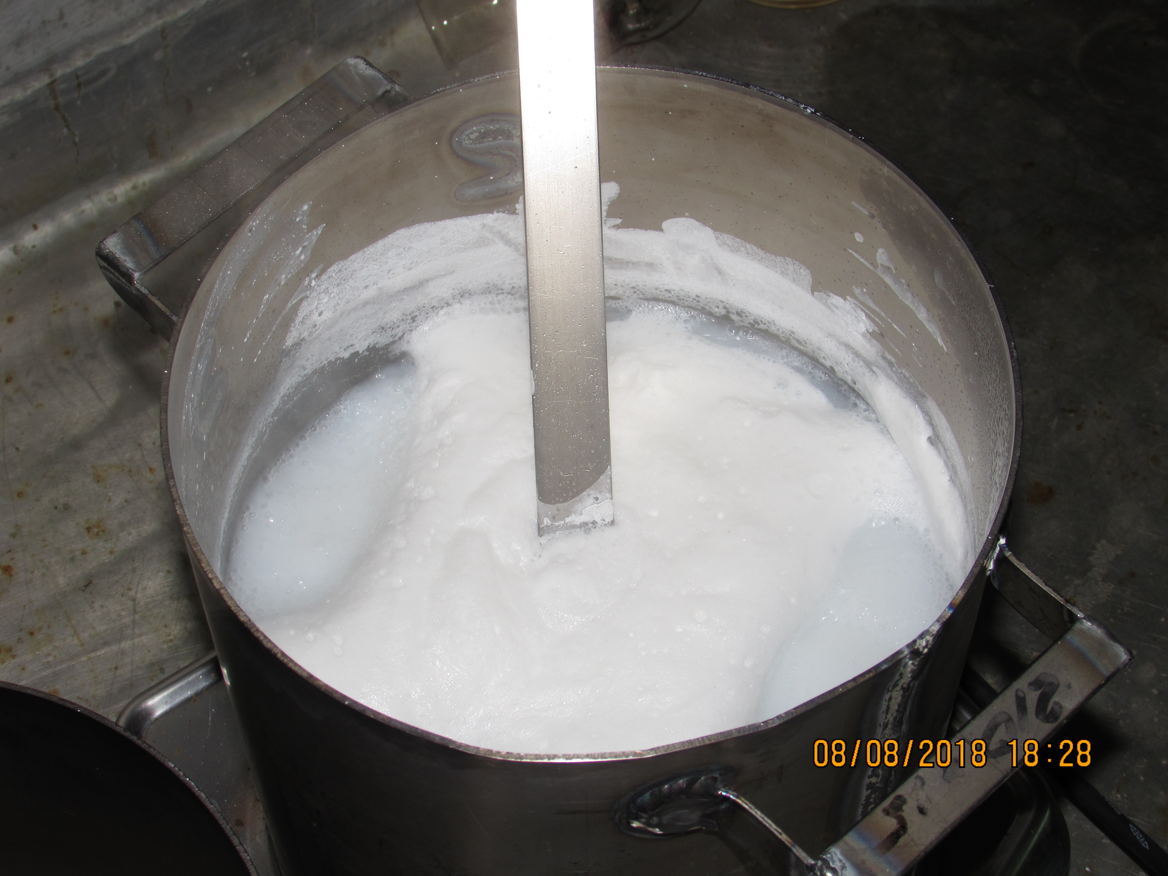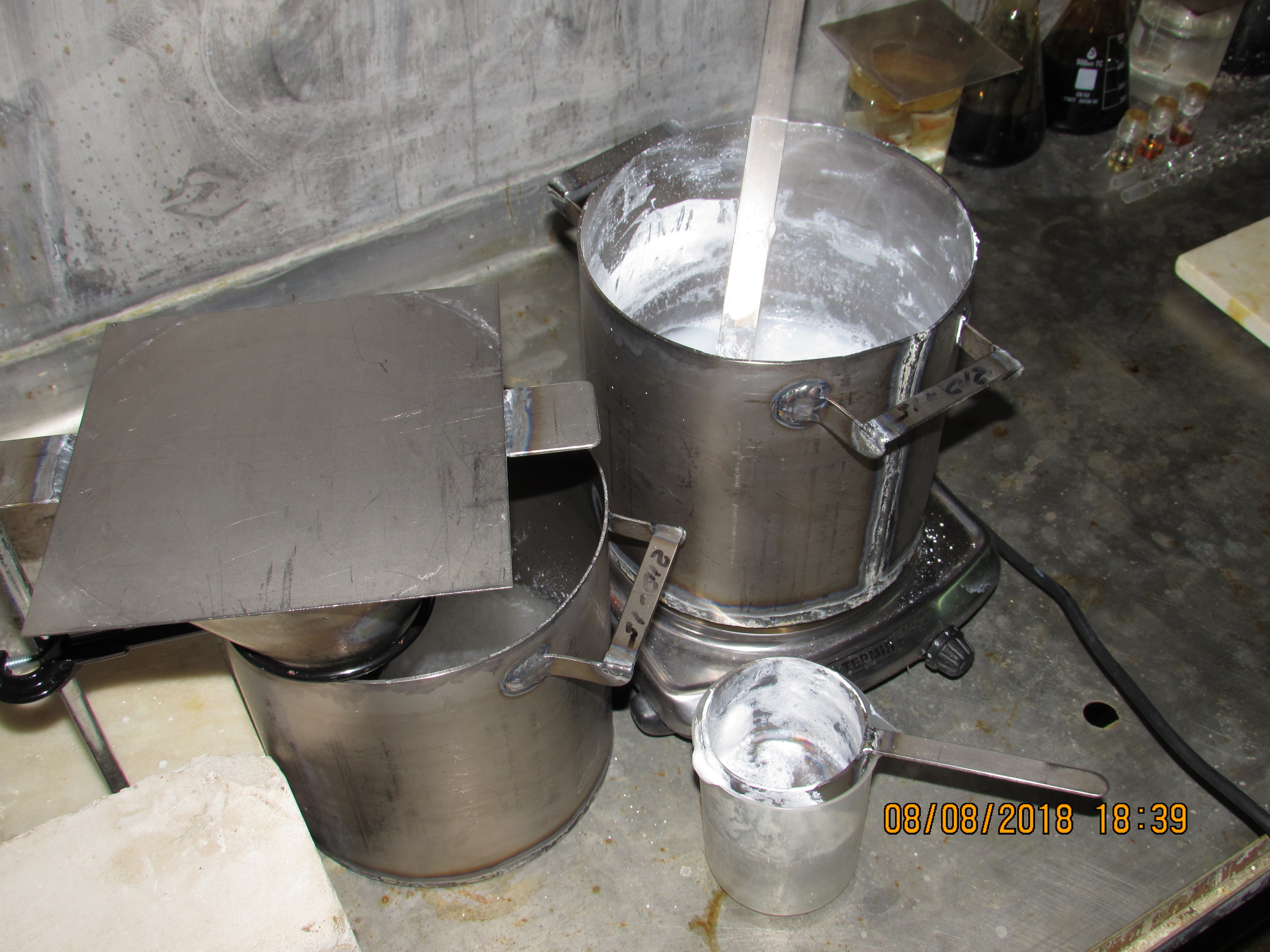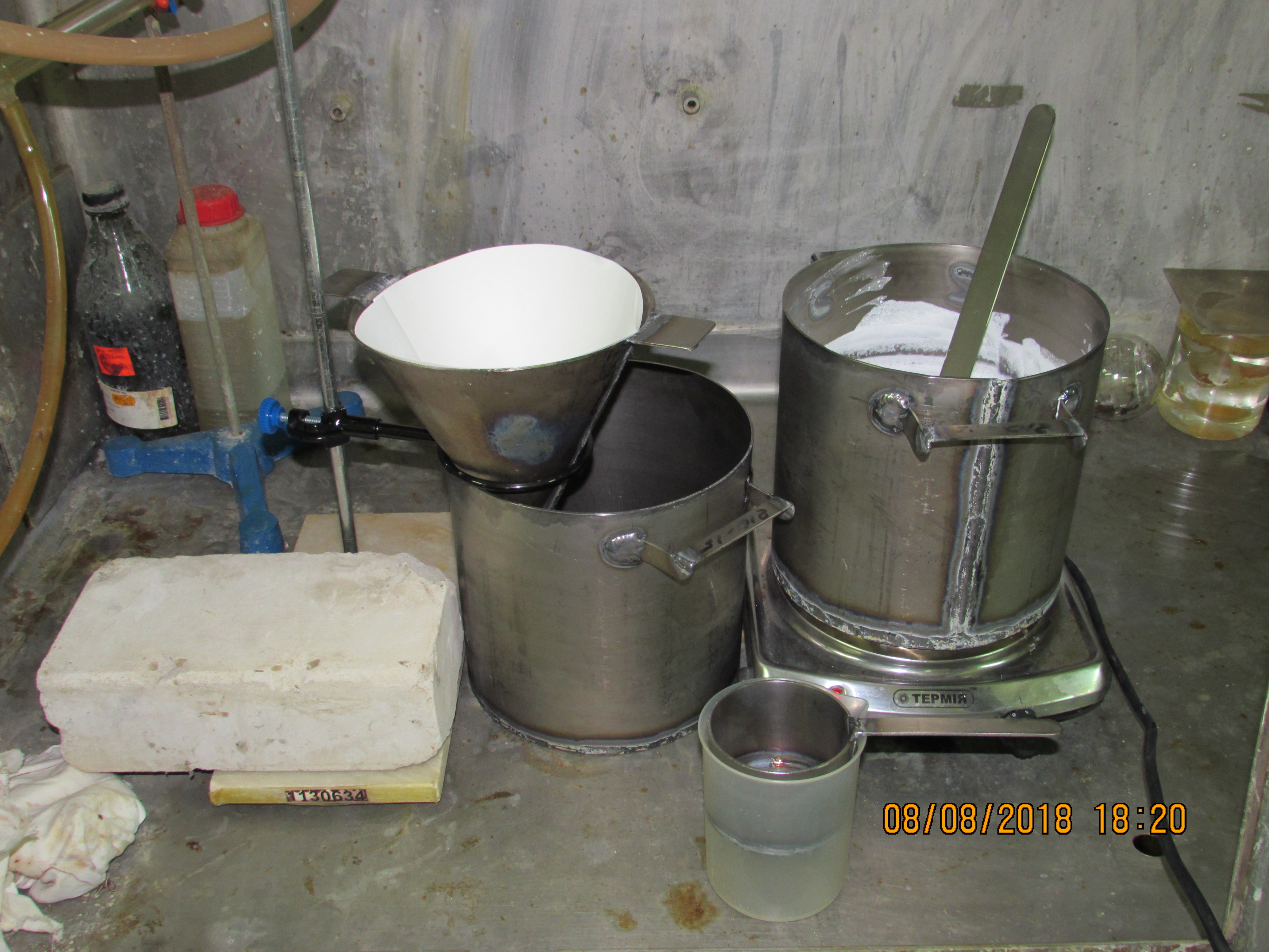 Обратите внимание, что вся посуда сделана из листового титана: и кастрюли, и черпачок, и воронка, и пластинка для размешивания раствора. Подобная посуда очень практична для наших целей: помимо устойчивости к растворам щелочей ее еще и очень трудно разбить :)