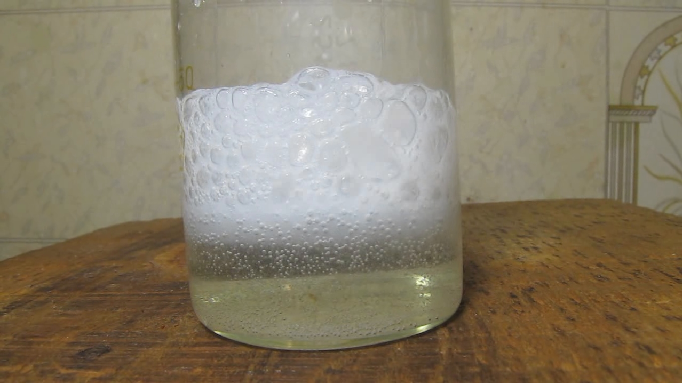 File comment: Раствор в стакане немного остыл, видно образование кристаллов