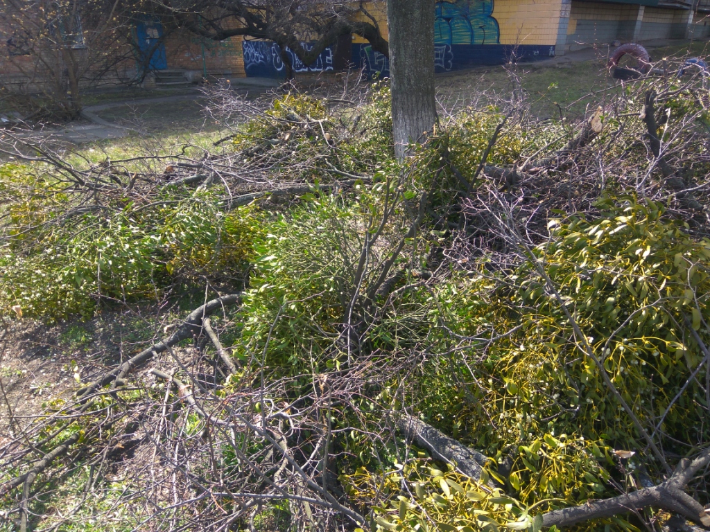 Одно из деревьев выглядело даже не зеленым, а желтым - омела начала отмирать вместе с угробленными ней ветками дерева. К сожалению, тогда не сфотографировал - разрядился телефон (пришлось идти незнакомой дорогой без карты).