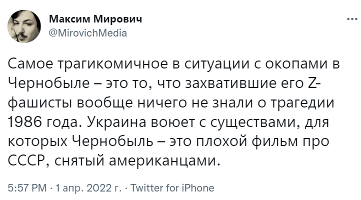 Россия совершила акт ядерного терроризма. Станцию позволили вам захватить, чтобы избежать 6 новых Чернобылей. Пишу не просто так: наше предприятие занимается радиационной безопасностью.