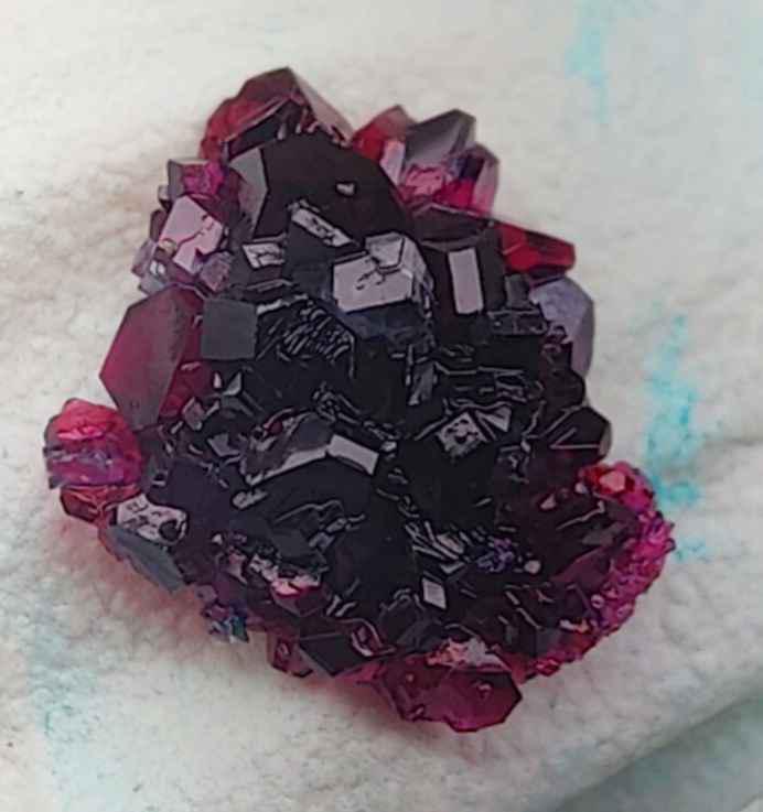 Когда я учился в школе, квасцы хромокалиевые продавались в магазине фототоваров. Октаэдрические кристаллики поразили меня своим дихроизмом. К тому времени я видел выращенные другими кристаллы алюмокалиевых квасцов и медного купороса. Купорос не впечатлил из-за низкой симметрии. Возникла грандиозная идея вырастить кристалл хромокалиевых квасцов на октаэдрическом каркасе из проволоки и ниток, с лампочкой внутри для подсветки.