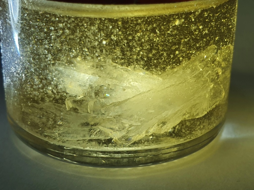 Но первые же приготовления повергли меня в тупик. Для приготовления насыщенного раствора я применил подогрев, при этом раствор стал зелёным и липким, последующее охлаждение не помогло. Знаний не хватало, я не понимал, что происходит.