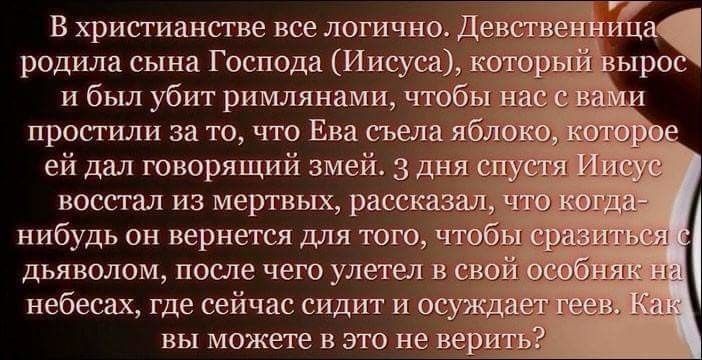 Взяв за основу высказывание Анжелы на первом курсе, что «в Аду скорее настанет зима, чем я с тобой пересплю», а так же тот факт, что сегодня мы проснулись вместе — мы придем к однозначному выводу, что Ад замерз. Из этого следует, что Ад не в состоянии более принимать души. Остается только Рай — что и подтверждает наличие Бога. Этим, видимо, и объясняется тот факт, что Анжела всю прошлую ночь кричала: «О, Боже!»