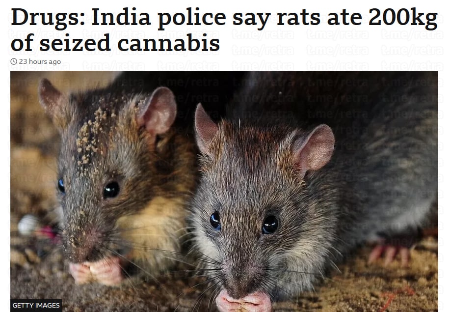 Суд в Уттар-Прадеш, рассматривая дело о незаконном обороте наркотиков, попросил полицию предоставить конфискованную марихуану. А полицейские ответили, что каннабис съели крысы. Все 195 кг.