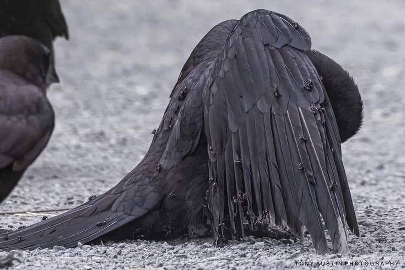 Фотографу Тони Остину удалось заснять редкие кадры муравления вороны. Прогуливаясь недалеко от своего дома Тони заметил необычное поведение птицы: ворона прыгала туда-обратно, садилась на муравейник, опускала крылья и снова прыгала. Не понимая, что происходит, он сделал несколько кадров. Уже дома, во время обработки фотографий, Тони заметил на черной птице муравьев.