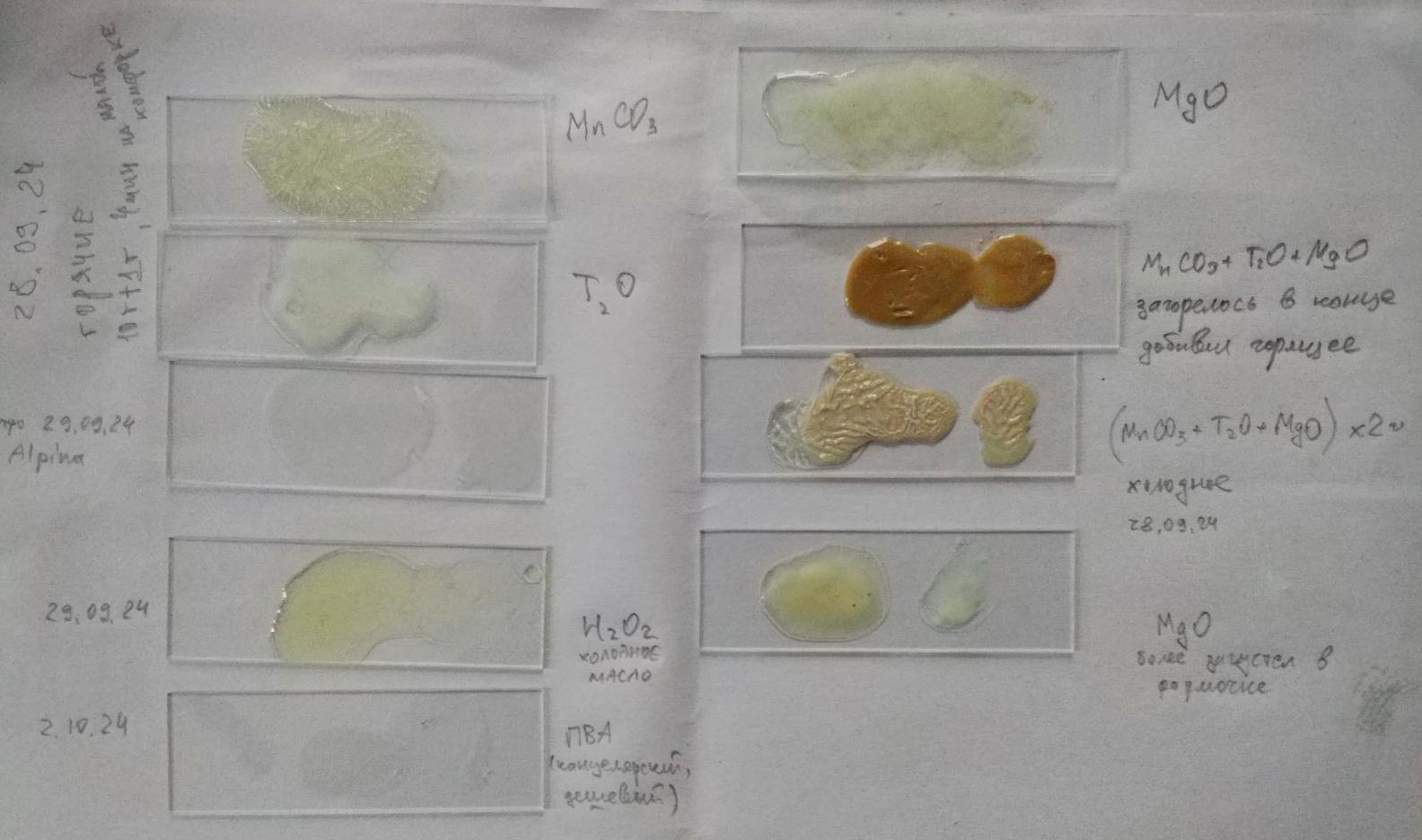 3. Все остальные смеси масла либо вообще не затвердели, либо пленка образовалась, но при касании палец оставался маслянистым. Даже для MnCO4 с холодным маслом!