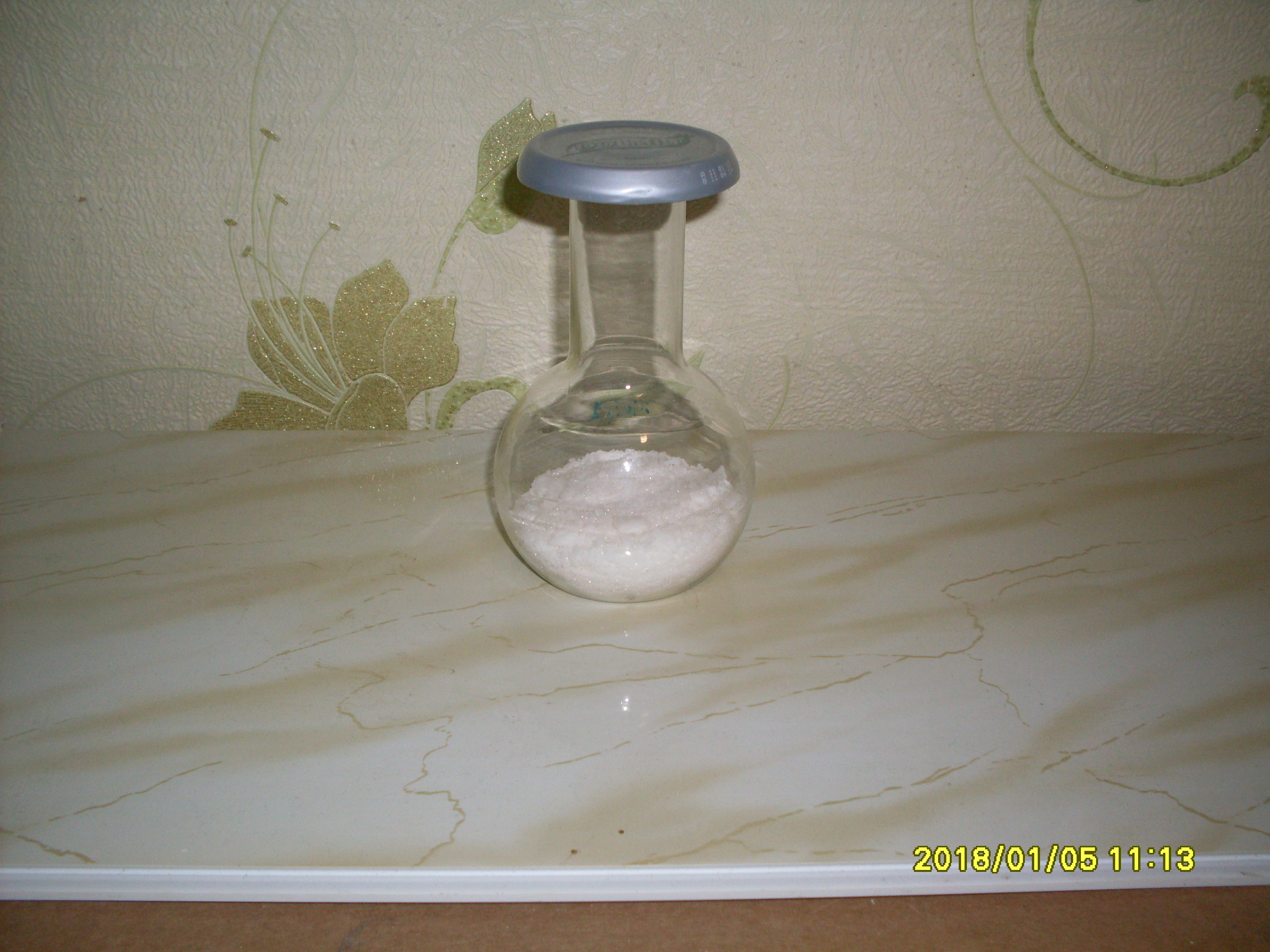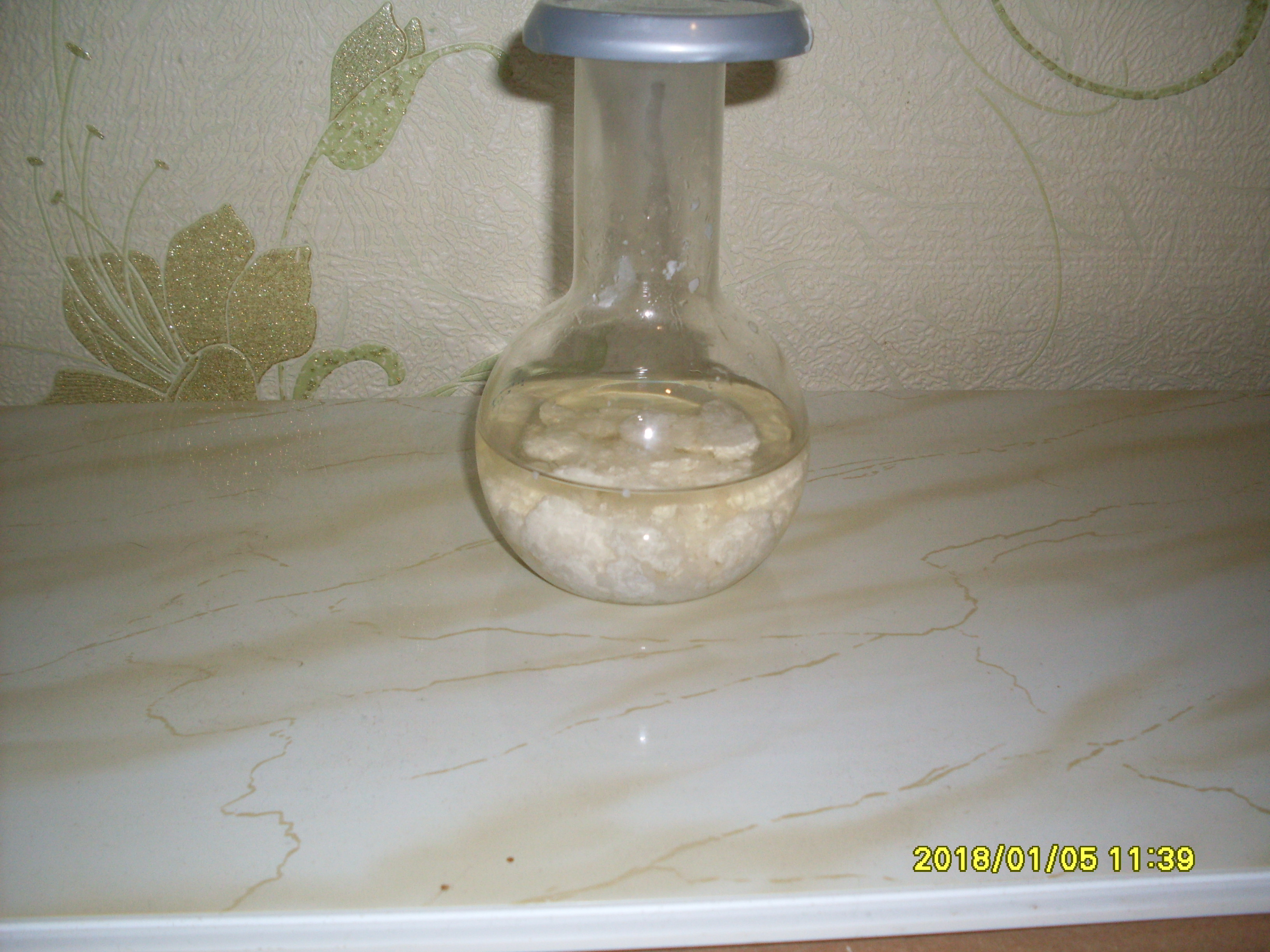 8) Далее перелил в баночку (получился р-р, насыщенный при 95 °C), выдержал непродолжительное время в кипящей водяной бане для р-рения волокнистых кристаллов E-211.