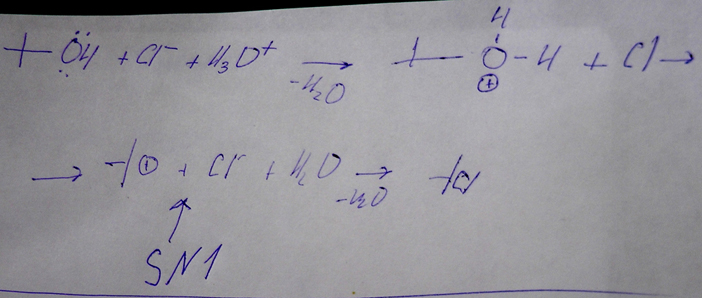 Допустим реакция 2,2-диметилэтанола с HCl в водном растворе. В результате реакции получается соответствующий галогеналкан и вода. Первой ступенью этой реакции является диссоциация HCl на ионы. Кислород в 2,2-диметилэтаноле имеет две неподеленные электронные пары. Ион H+ присоединяется к кислороду. В результате получается нестабильный катион, который разлагается на воду и карбокатион (катион нестабильный, но все-таки слегка стабилизирован, благодаря индуктивному эффекту). Таким образом, в растворе остается только карбокатион и хлорид-ион. Происходит образование галогеналкана. В реакции участвует нуклеофил - хлорид-ион. Он в несколько стадий замещает OH-группу. Это реакция с механизмом SN1.