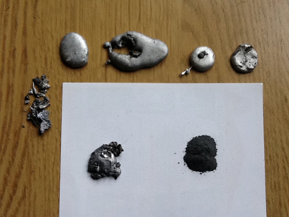 Решил поделать сплавы алюминия. Сплавлял с припоем (сплав олова и свинца), со свинцом, с оловом, с латунью, сплавить с медью не удалось (использую горелку которая потребляет минимальное количество газа, латунь плавит (900 градусов) но с громким скрипом, боюсь, это предел, есть и мощная горелка, только газ ест «немеренно», попробую с ней). Сплав алюминия с латунью (50 на 50), хрупкий, и несколько грамм можно растолочь в ступке за минуты, порошок в пламени загорается яркими искрами, и пламя становится зеленым!