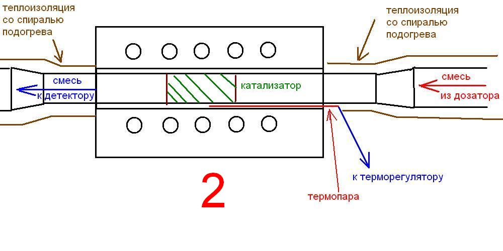 Да - переход для калибровки, но позже я понял, что для вашей установки он лишний: без хорошего нагрева не будет никакой конверсии, поэтому можно пускать смесь через реакционную колонку.