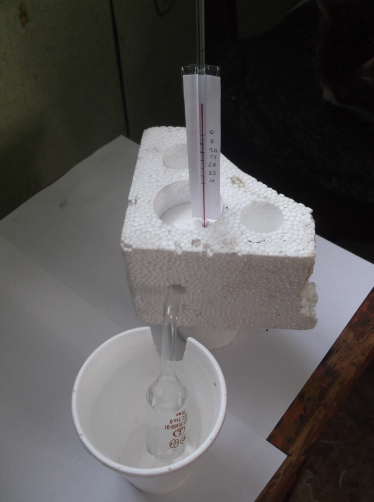 Предварительно была сделана морозильная камера из пенопласта. Для контроля температуры был вставлен уличный термометр.