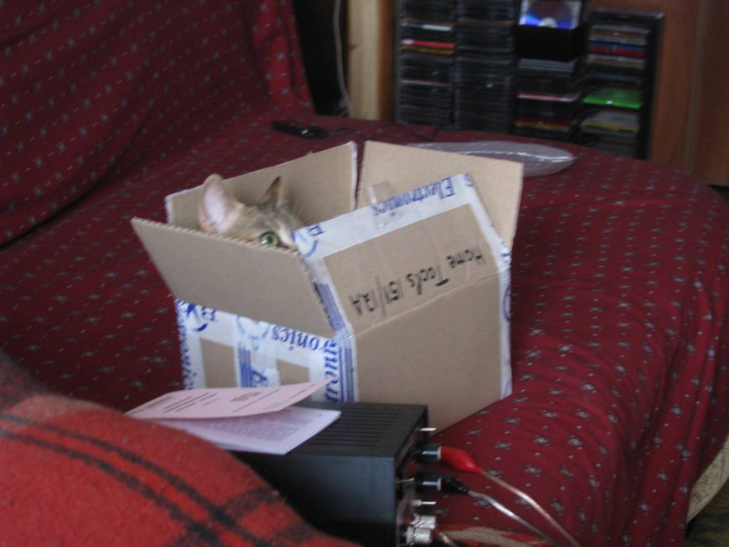 Саша купил новый блок питания. Кошка умудрилась втиснуться в маленькую коробку. Видимо, у нее клаустрофиллия.