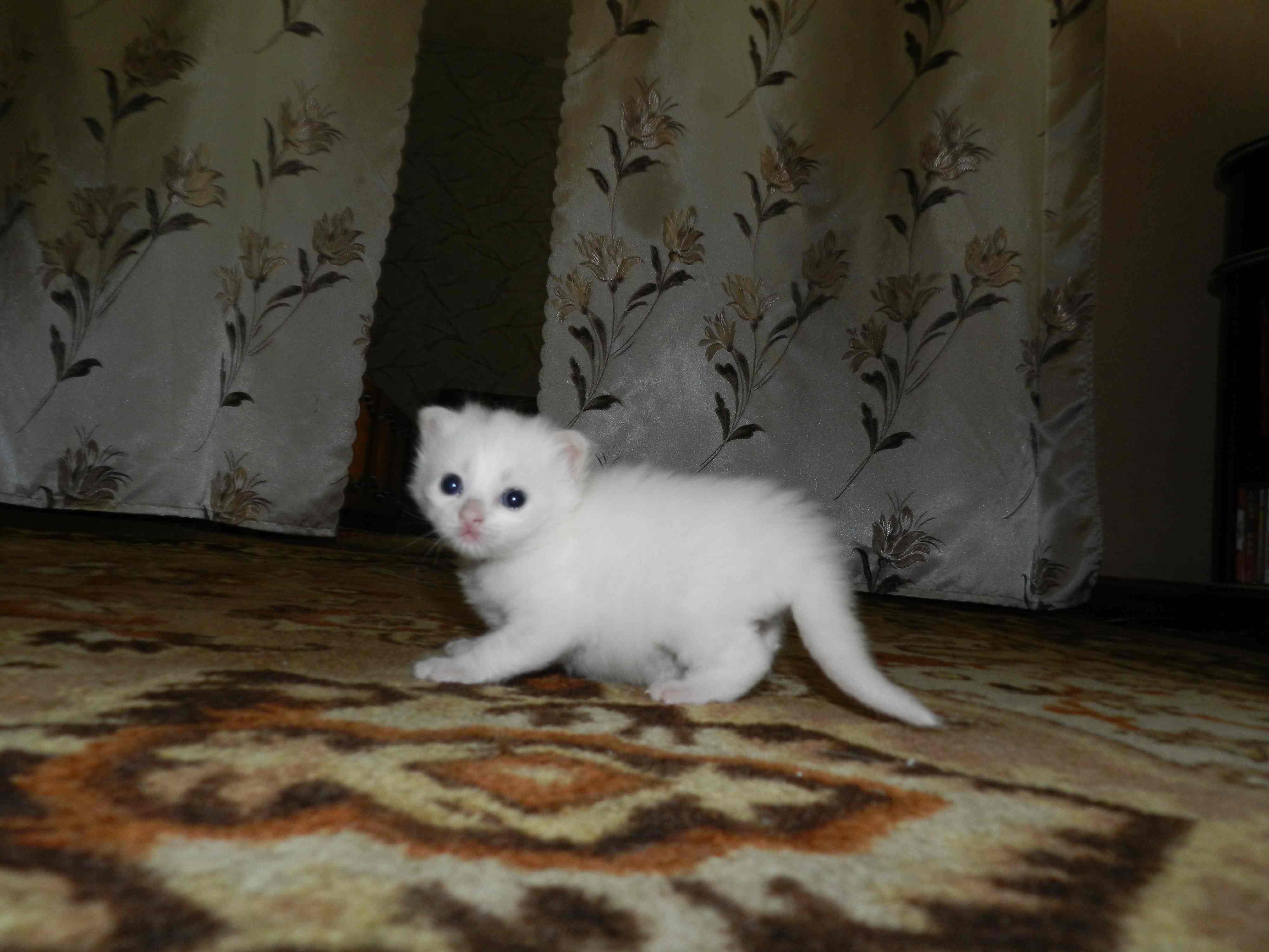 Нет. Вот мне теперь интересно будет ли эта кошечка глухой. Уж кошка со светлыми глазами очень свойственно это. Прошлые котята все былые - все глухие были. Но пристроили.