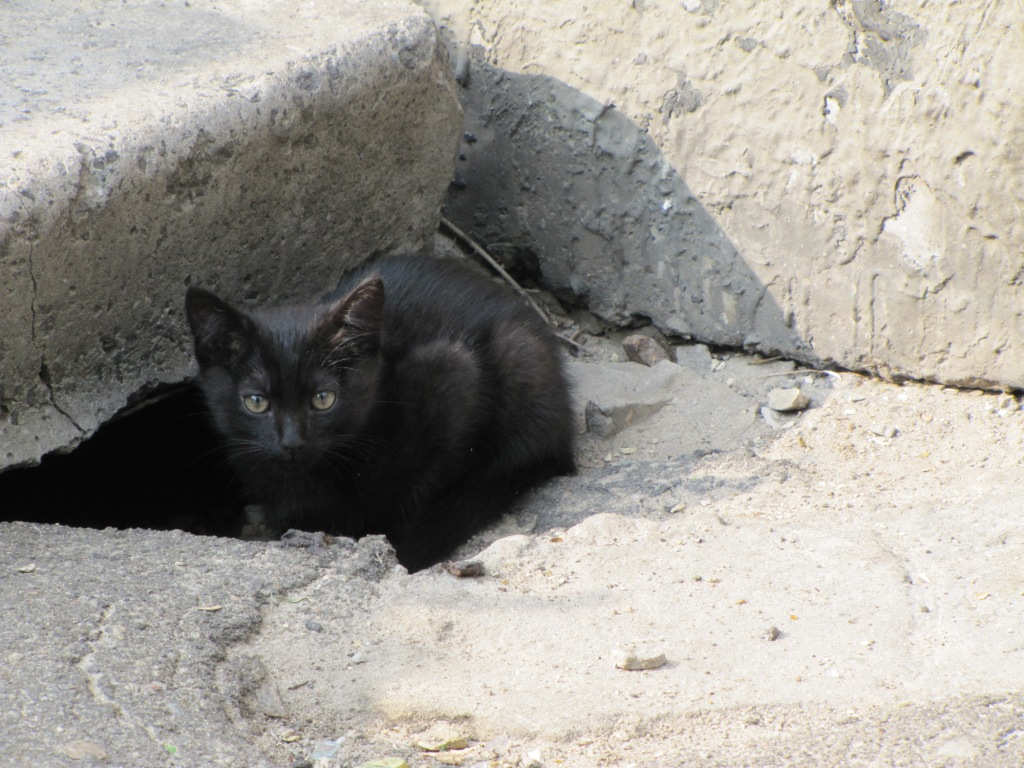 Во дворе черная кошка привела котят