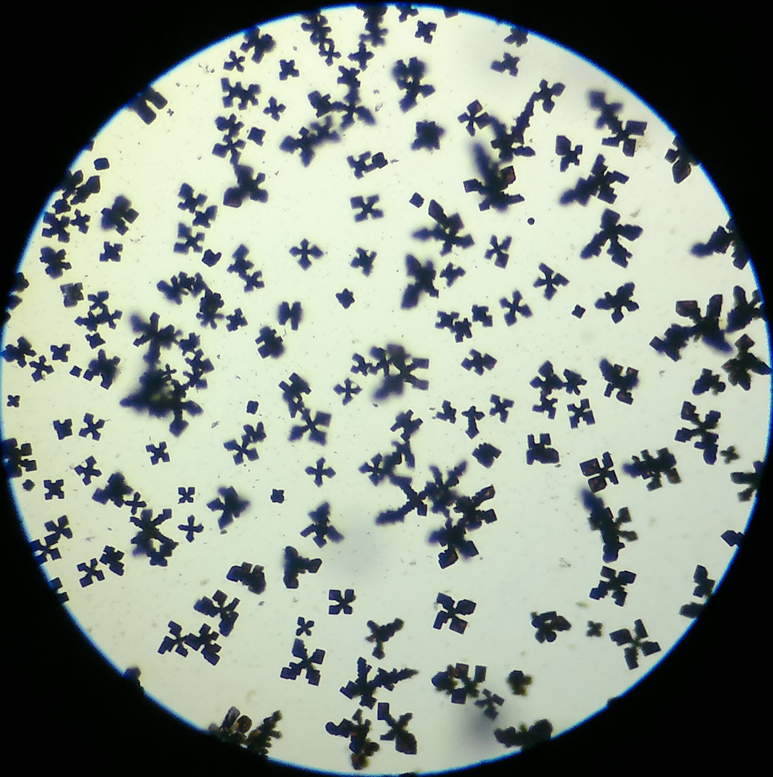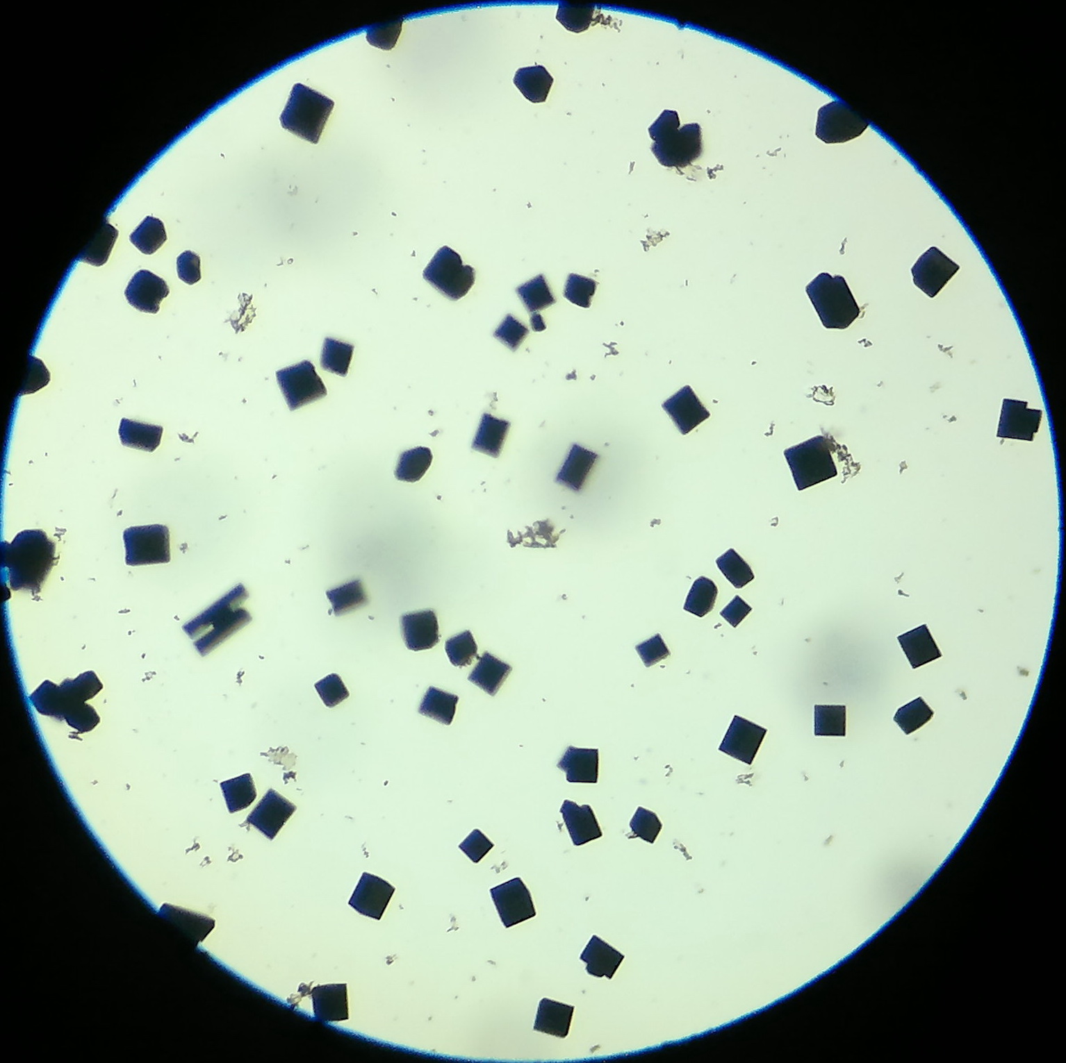 А вот фотка моего комплекса [Co(NH3)6](NO3)3 под микроскопом ..качество не очень но видно ..кристаллы приобретают форму квадратов и прямоугольников ...кстати заметил вот такую вещь комплексы у которых во внутренней координационной сфере шесть координированных групп кристаллизуются в прямоугольные кристаллы ...я прав или ошибаюсь?