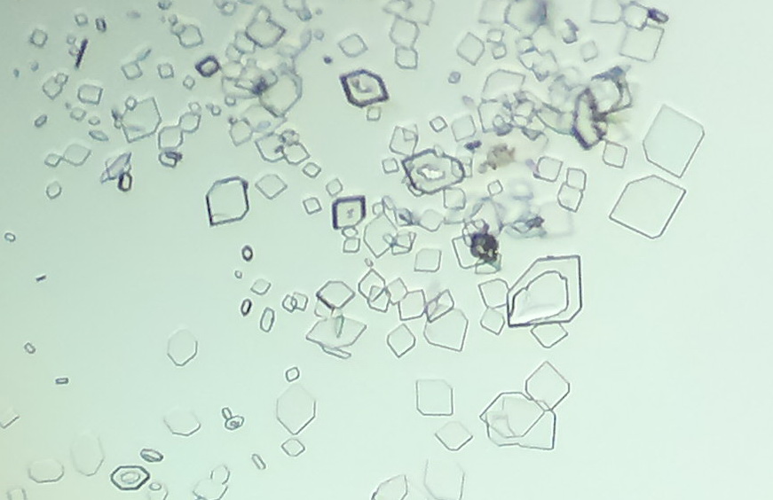 К капле раствора Ca(ReO4)2 добавил кристаллик RbCl. Сразу выпал бесцветный крист. осадок плохо растворимого RbReO4. Кристаллы получаются крупные, но из-за быстрого роста плохо сформированные. Имеют форму ромбов и октаэдров.