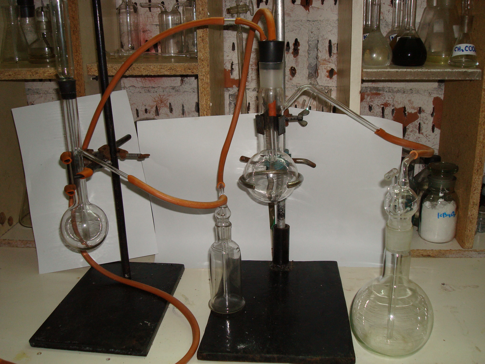 Колба после холодильника и служит предохранителем,если соляную кислоту затянет то она попадёт в эту колбу и не пойдёт в реакционную.