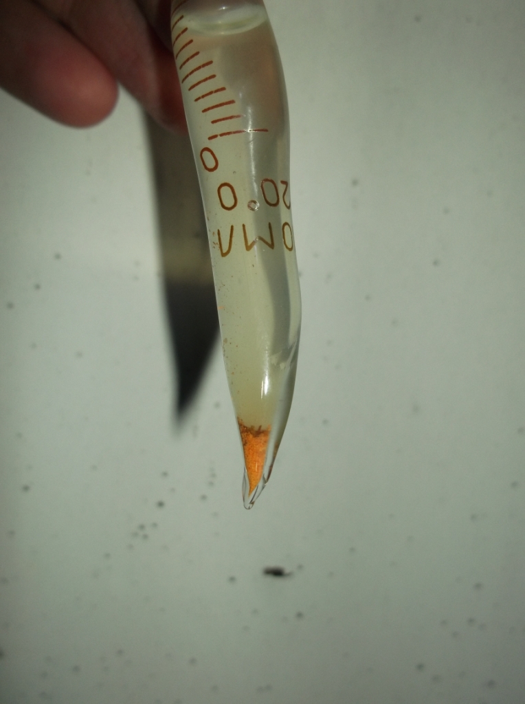 После всех опытов осталось 0.05 г смеси (значит всего ее было около 0.1 г). Чтобы не оставлять смесь без присмотра, высыпал ее на бумажку и поджег горелкой. Произошел взрыв с желтой вспышкой. Относительно силы звука судить не берусь т.к. предварительно заткнул уши ватой: достаточно и того, что в ушах звенело даже после некоторых взрывов смеси на пальцах (тут же количество смеси было в десятки раз больше).