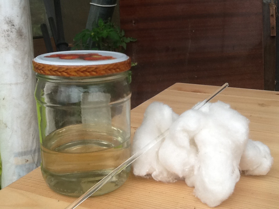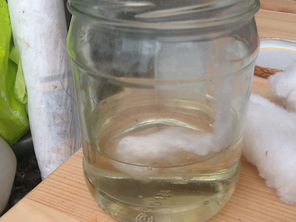 Смешал кислоты, дал отстояться в бочке с водой (кстати, температура поднилась совсем не значительно, градусов на 5, максимум, 10). Но с нитросмеси продолжали активно лететь пары азотной кислоты, пришлось "изобретать" влажную ткань, для защиты дыхания. В прохладную нитрующую смесь стал по кусочкам добавлять вату и тщательно "отжимать" (очень важно, чтоб вата пропиталась полностью). Когда погрузил всю вату, закрыл на банке крышку (лучше использовать колбу на шлифе, но все три большие были заняты, поэтому решил, что и под действием паров кислоты на пару суток крышки хватит (тем более, возможно, метал будет пассифицироваться)).