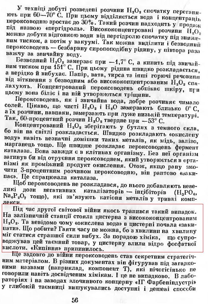 Во время Второй мировой войны произошел такой случай. На железнодорожной станции стояла цистерна с высококонцентрированной перекисью водорода. Неизвестно почему "окисленная вода" в цистерне начала "закипать". Что делать? Терять время было нельзя, потому что с минуты на минуту мог произойти страшной силы взрыв. По совету химика, который сопровождал этот секретный товар, в цистерну вылили ведро фосфорной кислоты. "Кипение" прекратилось.