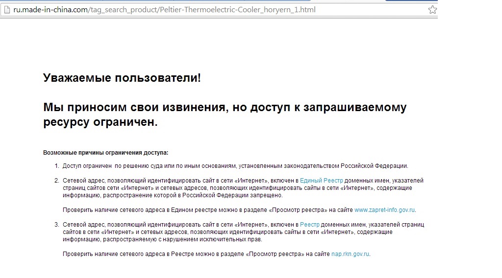...Вот и добрались до сути... Искал термоэлементы Пельтье для одного проекта. Попал на сайт _http://ru.made-in-china.com/tag_search_product/Peltier-Thermoelectric-Cooler_horyern_1.html ... А ОН ЗАПРЕЩЁННЫЙ!!! Объясните идиоту, тут-то что не так???