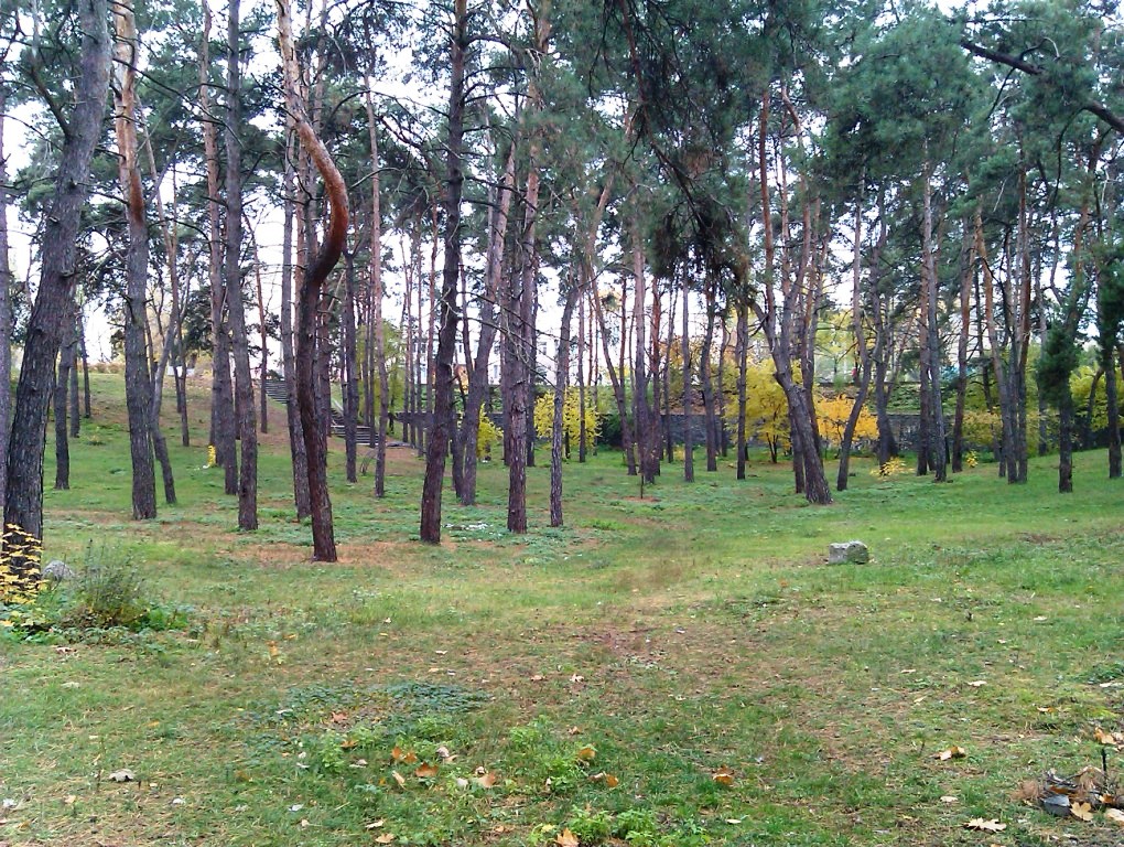 Размерами около 100 на 200 метров, соснячок этот потихоньку вымирает: почва, видимо, не совсем подходящая, да и подлеска здесь никакого - где ж тому симбиозу взяться? Впрочем, я не лесник, не специалист - может, причина совсем иная... Вижу только, что лесок загибается, чахнет. А когда учился в школе (её окна, кстати, можно разглядеть за редкими соснами), сосняк был в самом расцвете, если можно так выразиться. Даже летним днём в нём было прохладно и сумрачно, из кустарника налетали комары...