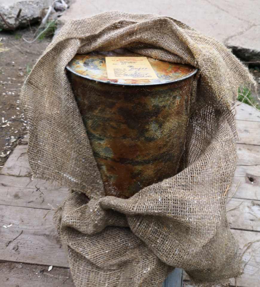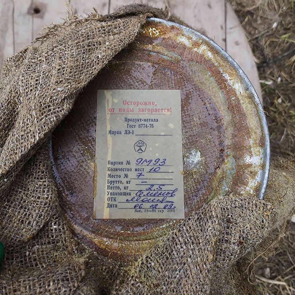 Литий находится в металлических банках, обёрнутых мешковиной и пропитанных солидолом.