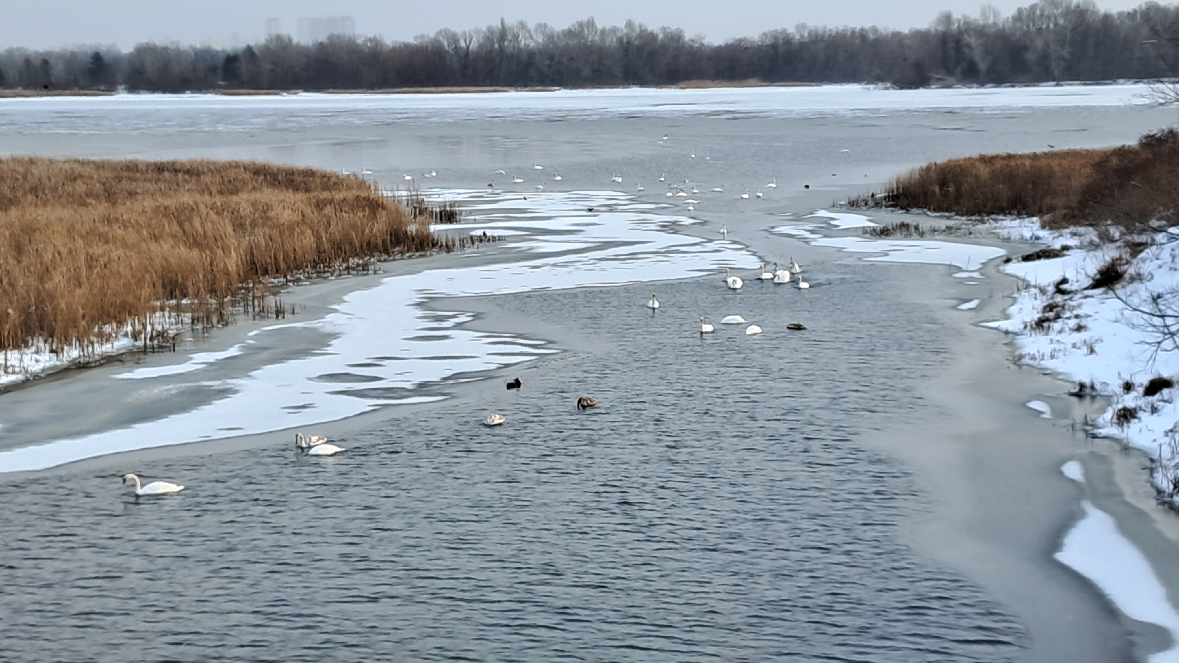 Днепр вчера. Прилетели полярные утки: белые, а молодые - светло-серые.