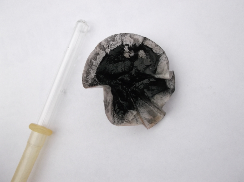 Что интересно: часть осадка, которая сушилась почти под сводом электроплитки (температура там едва ли достигала 100 оС), подсохнув, взорвалась самопроизвольно.