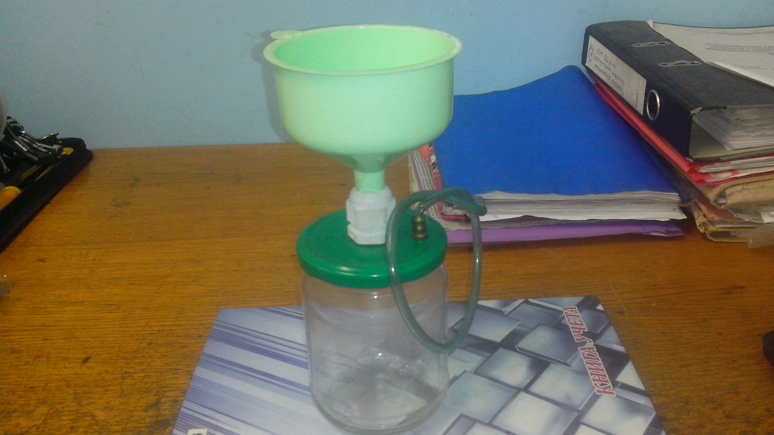 Разрежение планирую создавать ручным нагнетателем, хотя в планах сделать водоструйный насос. Единственное, что хочу доработать - лейку. Нужно внутрь установить пластиковую сетку-решетку для лучшей фильтрации.