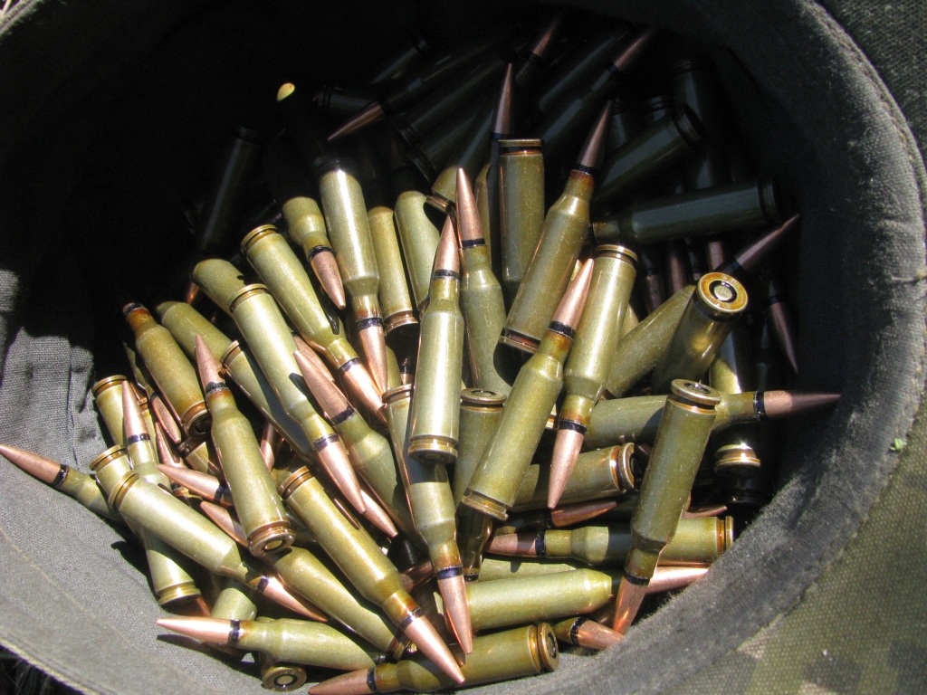 Перезарядка магазинов (5.45). В фуражке патроны для 4-х магазинов (стандартный боекомплект). Патроны с черной полосой, т.н. «усиленные» («бронебойные») – со стальным сердечником.