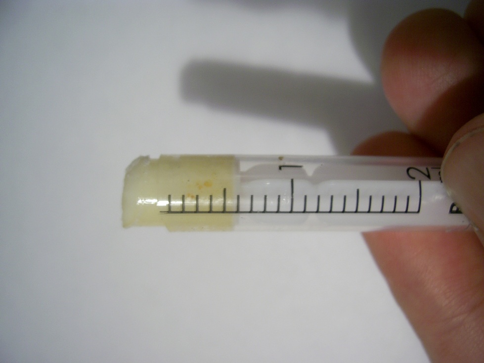 С вчерашнего опыта описанного выше осталось небольшое зёрнышко фосфора и я решил использовать его. Купив шприц на 2 мл. я постепенно наполнил его стружками парафина (хорошо подойдёт свечка), вынимая поршень я постепенно утрамбовывал парафин,при этом игла с чехлом плотно надета на носик шприца. Когда утрамбовал до 0,5 мл я достал пинцетом кусочек фосфора, осторожно обсушил его фильтровальной (хорошо подходит также туалетная) бумагой. При этом не допускайте трения и прикосновения пальцев. Фосфор очень легко загорается. Имейте наготове сосуд с водой для тушения! Быстро бросив в шприц фосфор (он при этом "хотел" загореться внутри шприца) я сразу засыпал его парафиновой стружкой и затрамбовал поршнем. Парафина было примерно 0,9 г., до отметки 1 мл., по справочнику на 1 г парафина требуется 15 мг. фосфора, так что хватит фосфора полученного из одной упаковки пистонов.Затем налив из чайника крутого кипятка в большую консервную банку я помести туда шприц, постоянно помешивая им воду и периодически встряхивая раствор, парафин расплавился и над поршнем образовался пузырёк воздуха, позволяющий перемешивать смесь встряхиванием. Растворяйте несколько минут (4-5 мин.) Затем шприц поставьте вертикально, чтобы парафин затвердел. После затвердевания аккуратно срежьте лезвием или канцелярским ножом верх шприца (осторожно могут быть нерастворившиеся маленькие капельки фосфора, но при тщательном растворении их не будет) Выдавив поршнем "мел" на несколько миллиметров, подравняйте лезвием край, срезав его, теперь можно при рисовании удобно регулировать его количество и не трогать руками парафин. После опытов втяните оставшийся мелок и шприц с ним поместите в воду для хранения. Рисовать хорошо на куске стекла или ещё лучше на ксероксном листе бумаги, закрепленном на ипровизированном "планшете". Рисовать следует в тёмном помещении после адаптации глаз в течении 5 минут, свечение довольно слабое, как и свечение чистого фосфора. Помните, что хотя фосфора в парафине немного, и "мел" относительно безопасен, не допускайте попадания его на кожу!