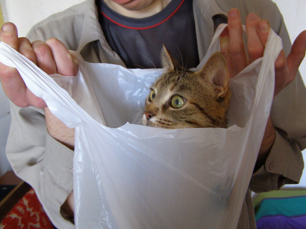 Мы убедили кошку, что пребывание усатых и полосатых хищников без таких повязок в воскресенье категорически запрещено (с 11-00 до 11-05).