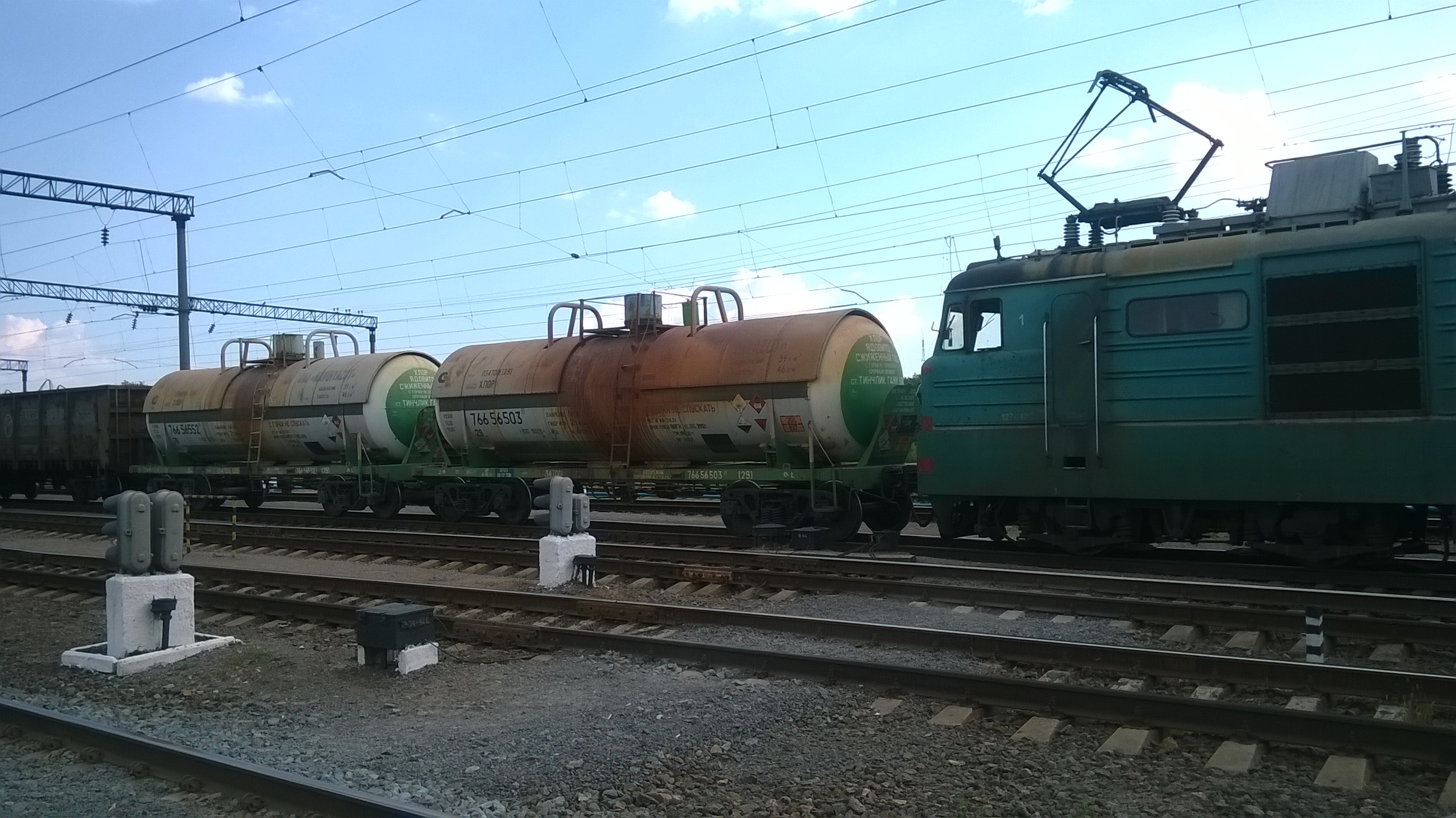 Цистерны с жидким хлором. Сфотографировал, когда шел с работы через ж.д. пути. Хлор идет на обеззараживание питьевой воды.