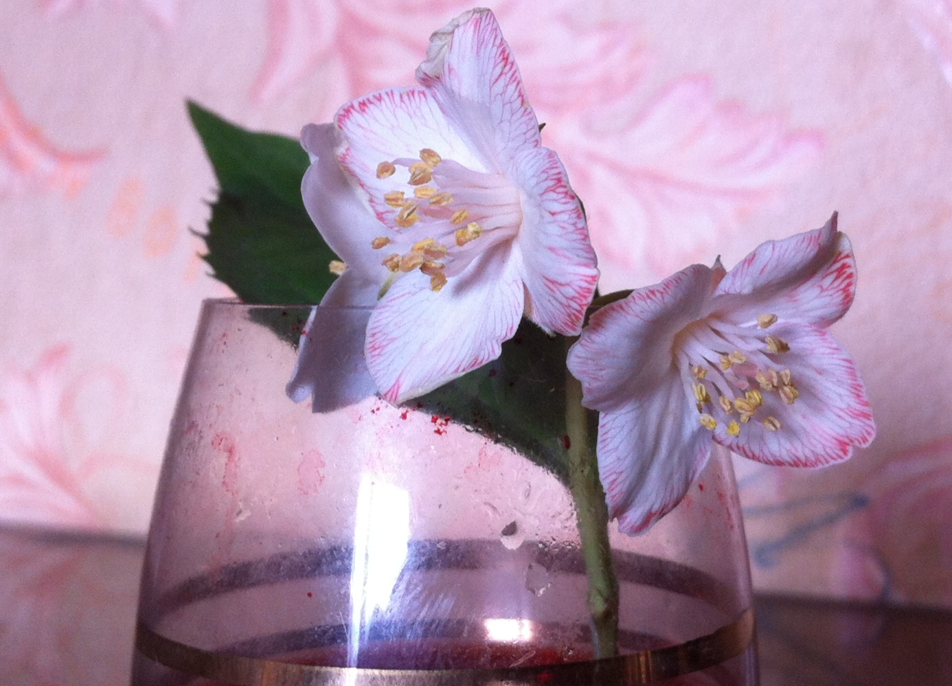 За основу был взят чебушник. Краситель - краска красного фломастера в воде.