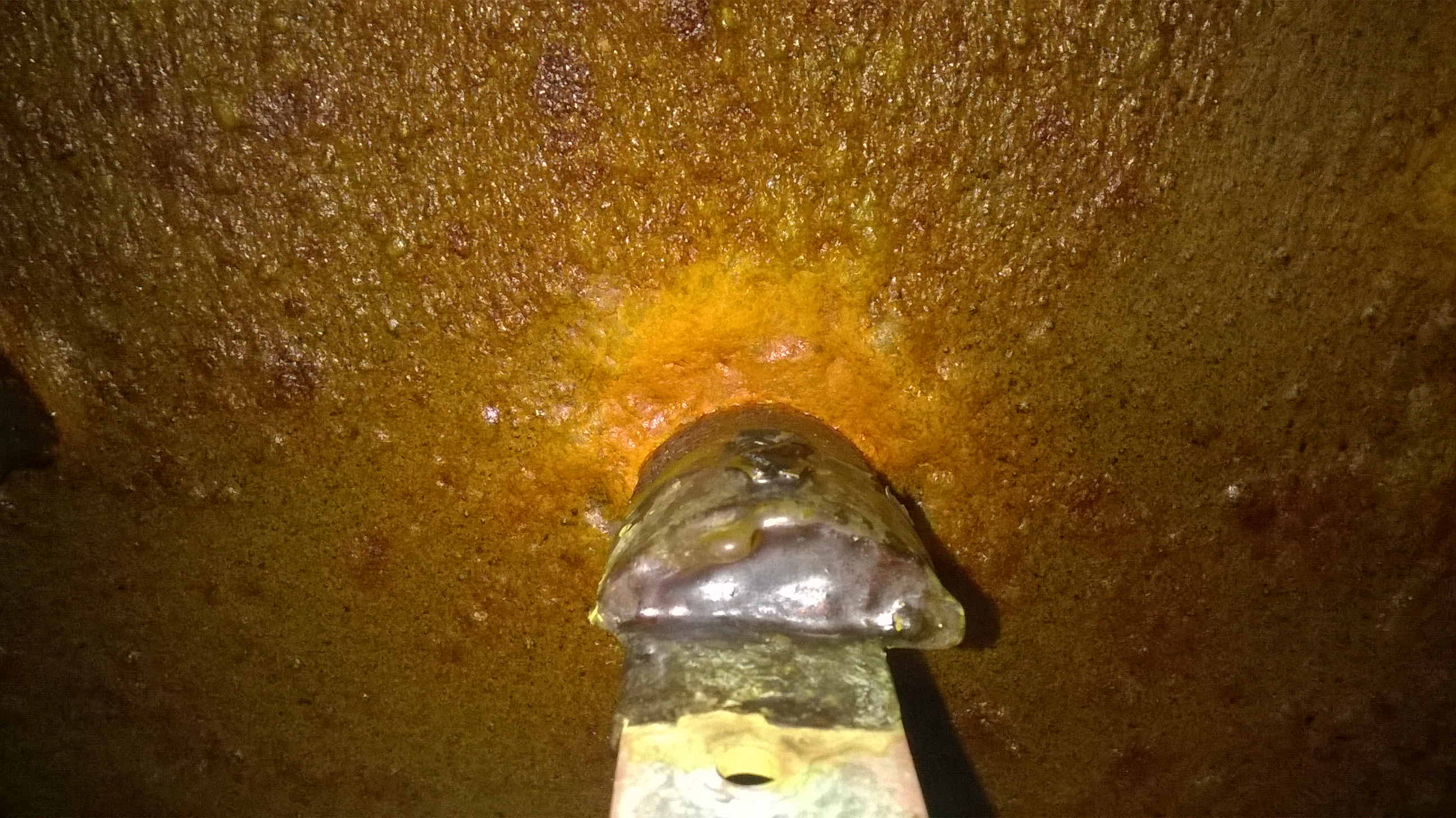 После выходных достаю анод из ванны блестящего никеля. Рабочая температура ванны - 55С, за три выходных дня она остыла и на аноде выпали иглы борной кислоты. Держу анод в левой руке, правой пытаюсь сфотографировать. В цеху темно, а фотографировать одной рукой - с телефона неудобно. Подходит рабочий.