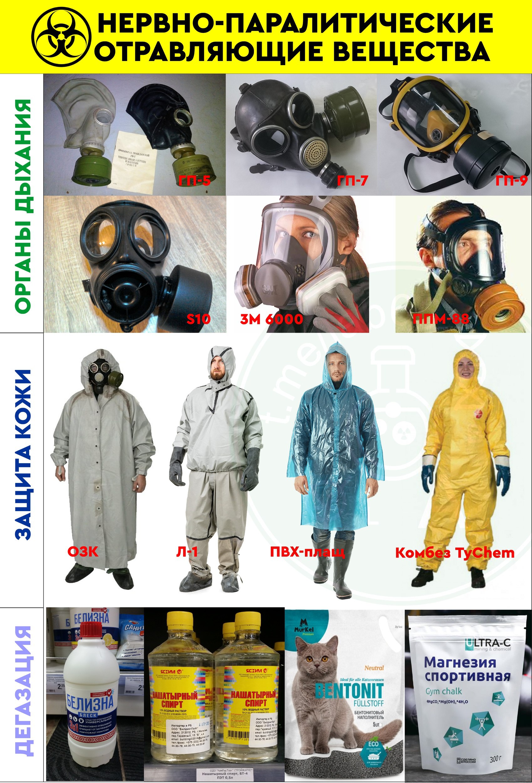 СИЗ: Из средств защиты дыхания нам подойдут: противогазы (на выбор отечественные ГП-5/7/9, зарубежные S10), панорамные/полнолицевые маски (ППМ-88, 3M 6000) c подходящими фильтрующими коробками. В каждой коробке обязательно должна быть противоаэрозольная защита не ниже класса P3 + угольный слой. Для защиты тела/кожи подойдут химические комбинезоны типа DuPont Tychem, старые советские костюмы химической защиты типа Л-1/ОП-1 (ОЗК), подходящие полиэтиленовые/ПВХ накидки-дождевики, в крайнем случае даже большие полиэтиленовые мешки (ссылка (https://t.me/lab66/602)). Не стоит забывать про перчатки, бахилы/сапоги.