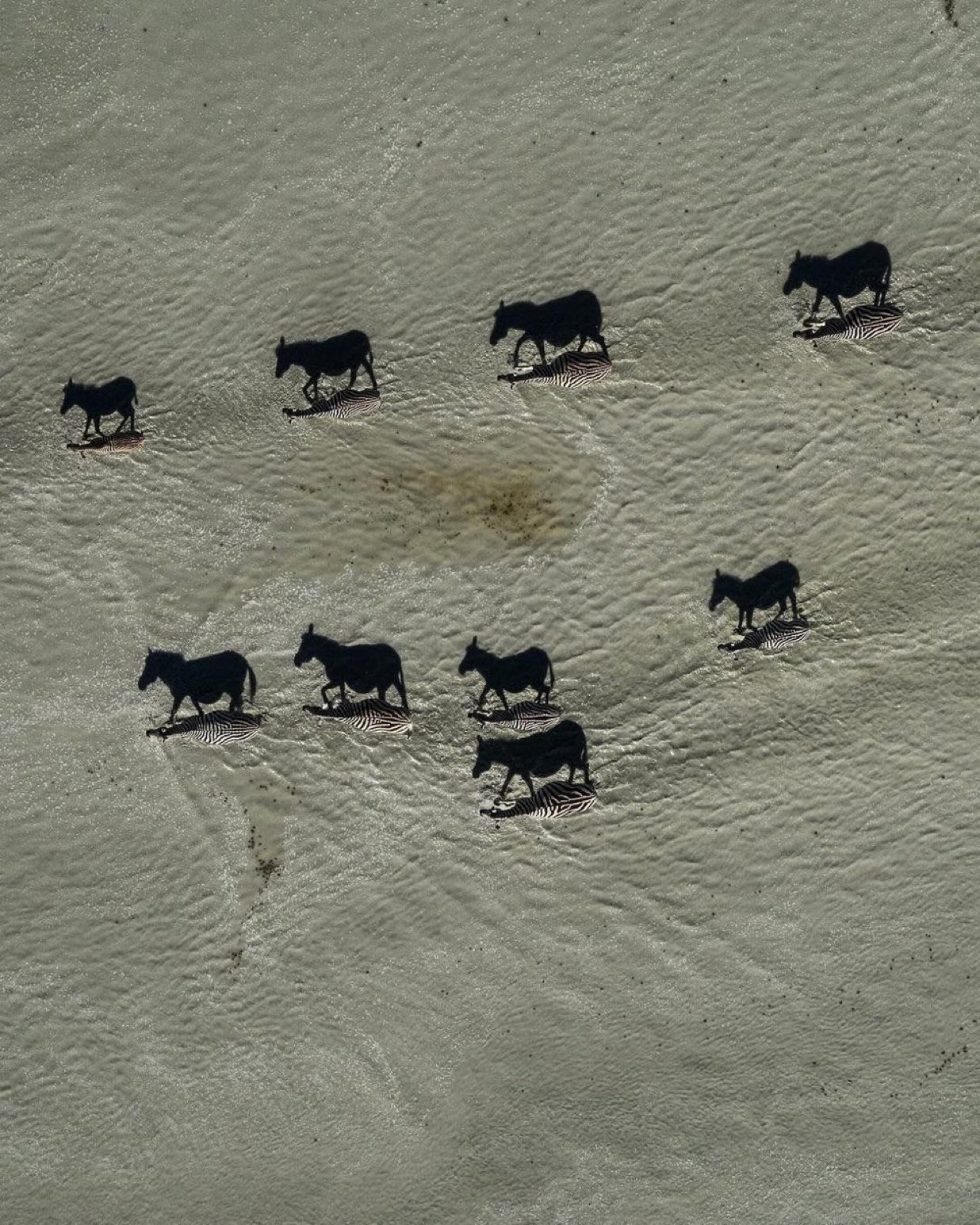 Black images are shadows of zebras. Zoom in and you will see zebras. Beverly Joubert, 2018.