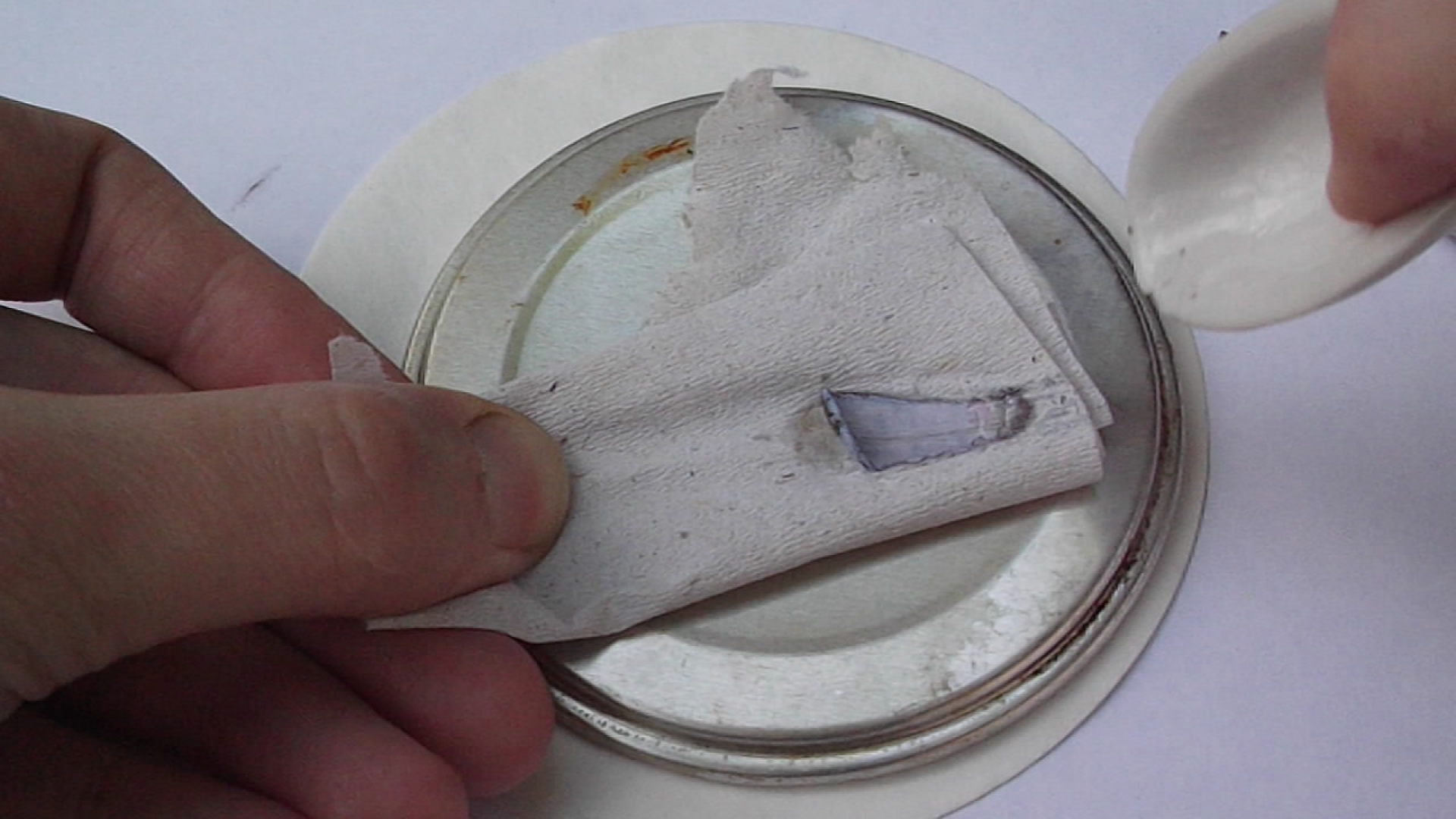 Попытался заснять опыт самовоспламенения калия при растирании на бумаге. Как оказалось фильтровальная бумага (синяя лента) не подходит. Идеально опыт идёт с туалетной.
