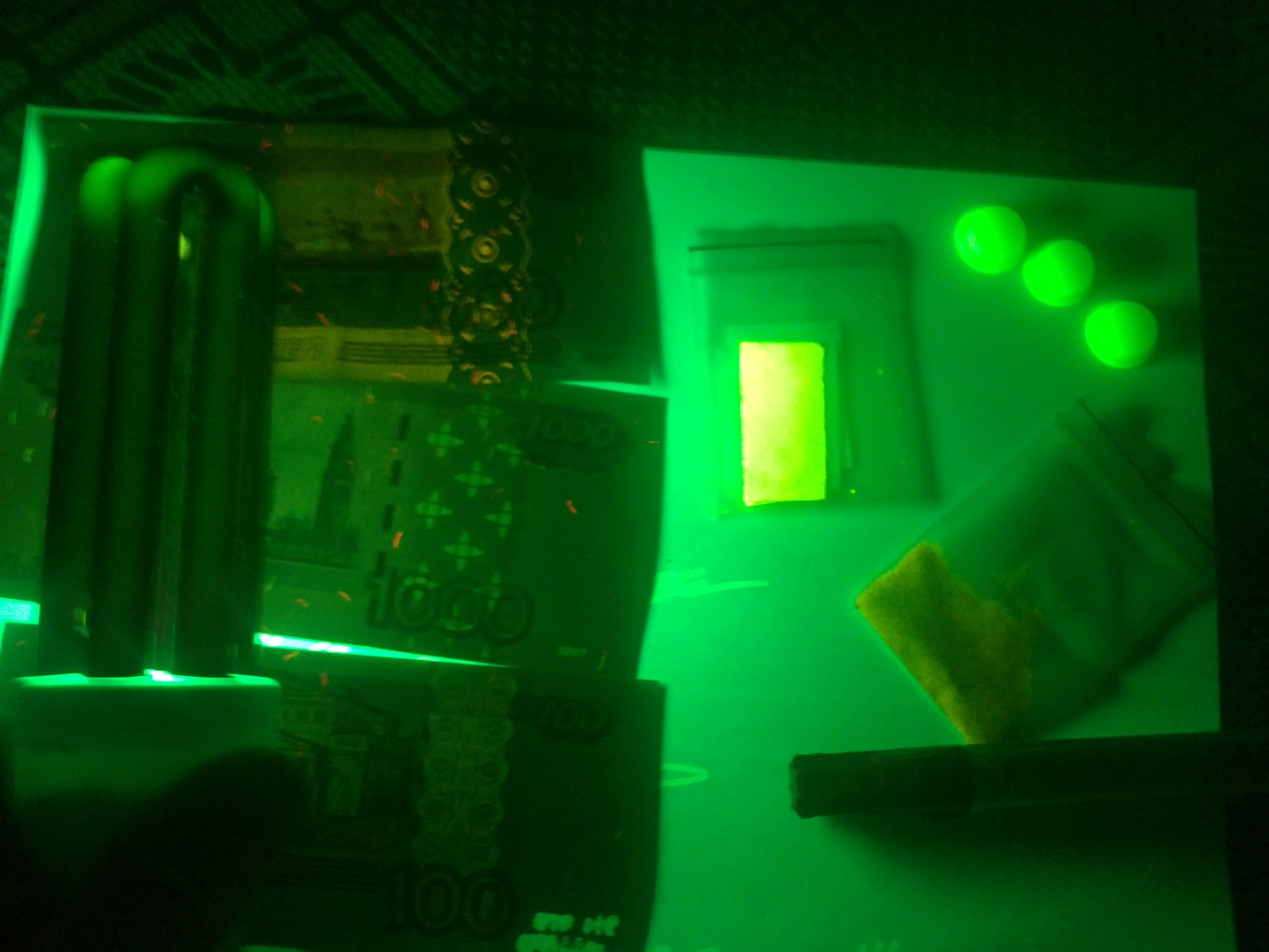Вчера под руку подвернулся сломанный кфк-2 и хотя под рукой не было отвертки с помощью куска полотна, пинцета и щипцов :bm: раскурочил его извлёк светофильтры. В качестве источника света был 5 мм светодиод. Однако результат меня удивил. Вначале взял 364 нм. Хотя видимого света практически нет, но полученный уф очень слабо подсвечивает предметы. Например в растворе флуоресцеина конус хотя и заметен, но ничтожной яркости. Любопытно но денежные купюры не светятся.