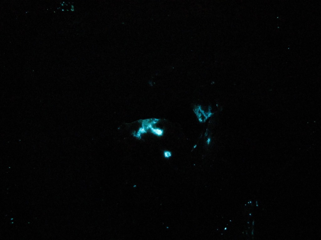 К сожалению, чувствительность камеры не вытягивает, но глазом видно, что кроме ярких очагов света имеет место слабое свечение всего рассола. Визуально свечение скорее синеватое, чем зеленоватое.