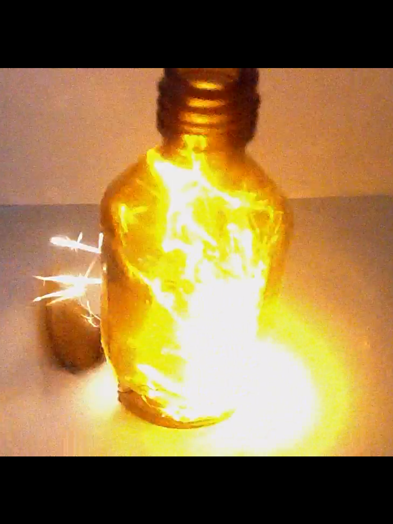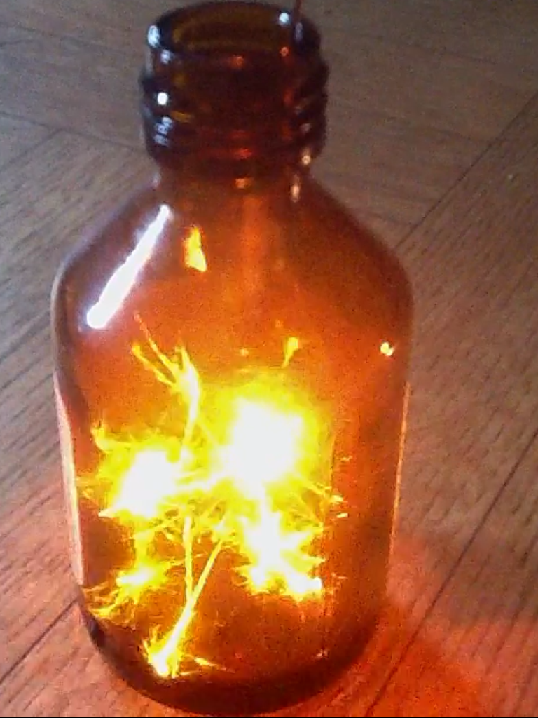 В колбу налил немного пергидроля, добавил марганцовки, прикрыл сверху чтобы не выходил кислород, свернул тонкую проволоку в спираль, с одной стороны примотал небольшой кусочек спички, поджог и внес в колбу. Сначала спичка вспыхнула ярким светом, а потом и проволока загорелась, не уступая в яркости и искрах бенгальскому огню.