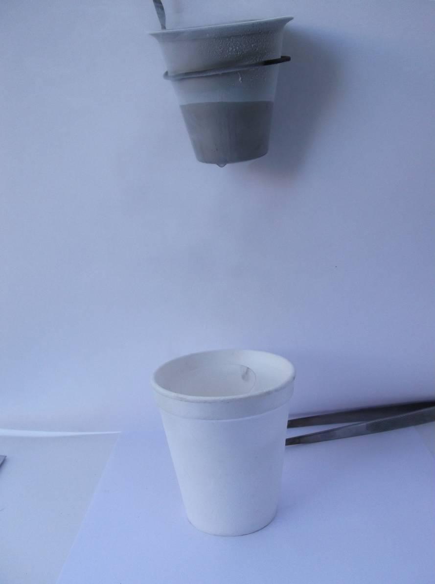 В пенопластовый стакан с азотом поместил до упора 50 мл мерную колбу и прижал штативчиком от РН- метра, чтобы не всплывала и подливал время от времени до краёв азот. Минут через 50 получилось заметное количество жидкого воздуха - около 30 мл. Лучше, конечно, колбу с длинным горлом (или нарастить его) погружать в термос или дьюар, но азота было не жалко. Вполне достаточное для опытов. В принципе если получать немного воздуха для опытов то так удобнее, чем с металлическим стаканом.