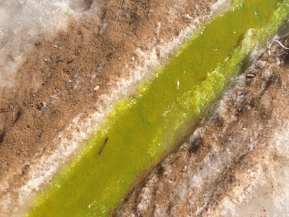По дороге наконец потёк речей. Я достал заблаговременно заготовленный краситель - флуоресцеин. Высыпал несколько грамм в ручей, он стал медленно растворяться и окрашивать воду в зелёный цвет. Потом влил в ручей не много концентрированного, щелочного раствора флуоресцеина (на фото этого нет, но есть на видео). Флуоресцеин из крупных кусочков постепенно разваливался в мелкие (и растворение ускорялось). Добавил ещё несколько грамм красителя (для усиления окраски).