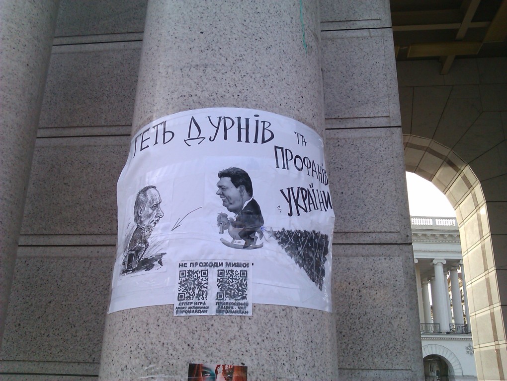 Вокруг одного из столов толпится народ, меняется. Подхожу и я посмотреть, что же тут такое. Оказывается - сбор подписей за отставку Януковича/Азирова. Что ж, дело правильное. Но реализовано тяп-ляп: на чистых листах А4 каждый желающий просто пишет свои ФИО, затем - подпись либо телефон. Ни тебе сквозной нумерации, ни каких-то контрольных печатей... - так, больше для самоутверждения. Что ж, и я черканул в никуда свою подпись - наноутвердился.
