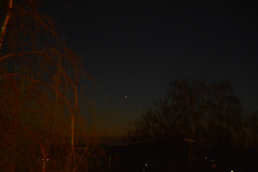 На следующий день тоже наблюдал, но фотографировать уже не пытался: во-первых, получить четкий снимок подобных объектов без штатива в принципе можно, но это сложно. Во-вторых, после работы я сначала зашел на рынок, когда возвращался, то понял, что если зайду домой, занесу покупки и возьму фотоаппарат, то прозеваю наблюдение: планета сядет за горизонт. Пришлось бежать с тяжелыми пакетами не домой, а к месту наблюдения Меркурия :)